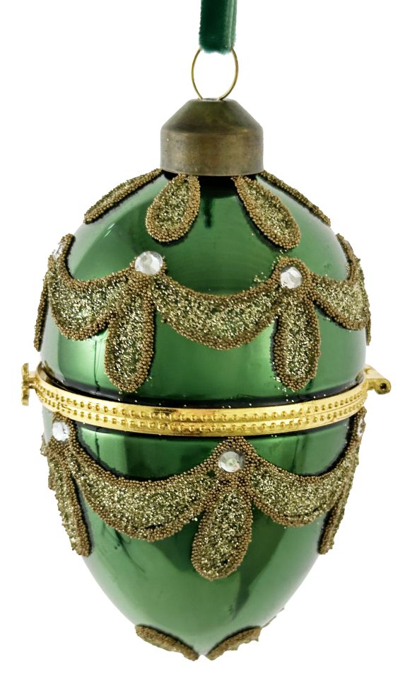 Glass opening egg shiny dk green w/gold glitter 11cm