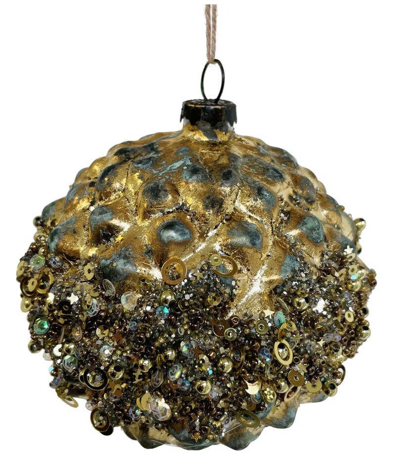 Glass ball gold frosted beaded wreath/tree deco 10cm