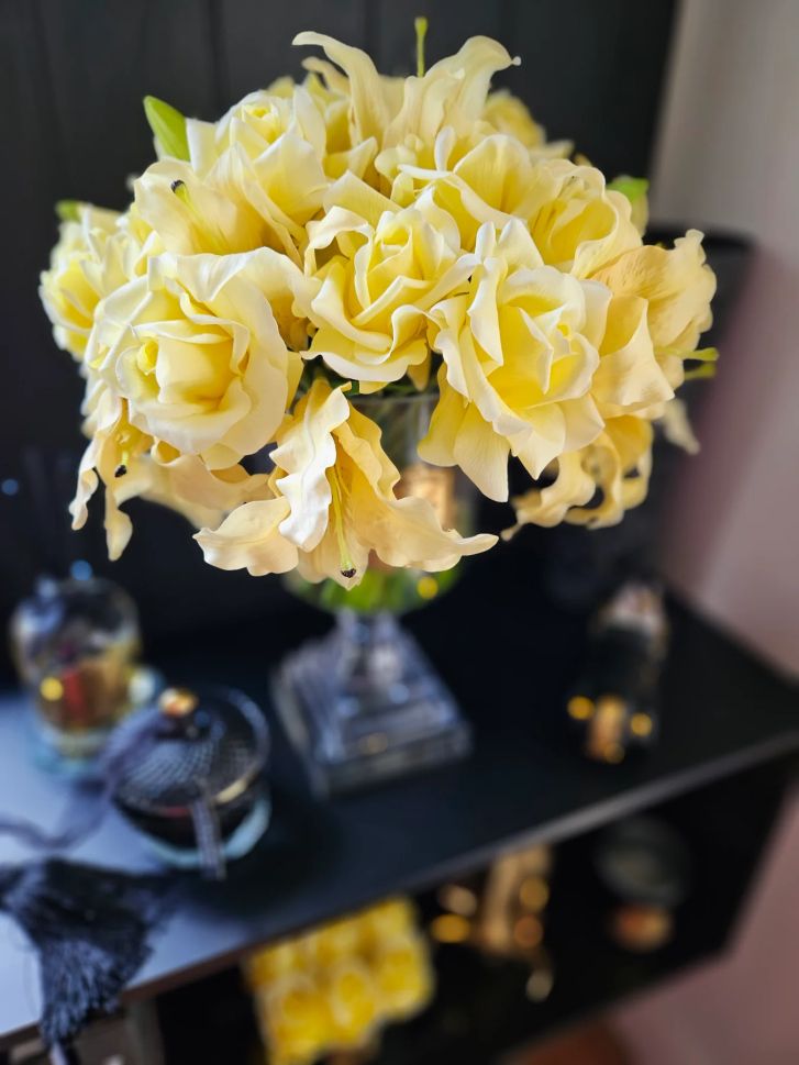 Всеки реалистичен парфюмен букет от Версайски лилии и рози е умело ръчно изработен и поставен в гел, което му придава вид на вода. Всяко венчелистче има специално естествено покритие, което му придава реалистичен вид. Всеки букет е аранжиран в луксозна ваза.