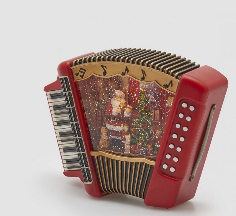 Създайте вълшебна празнична атмосфера у дома с тази очарователна коледна фигурка – Акордеон, украсен с блещукащ сняг, светеща лампа и сцена с Дядо Коледа.