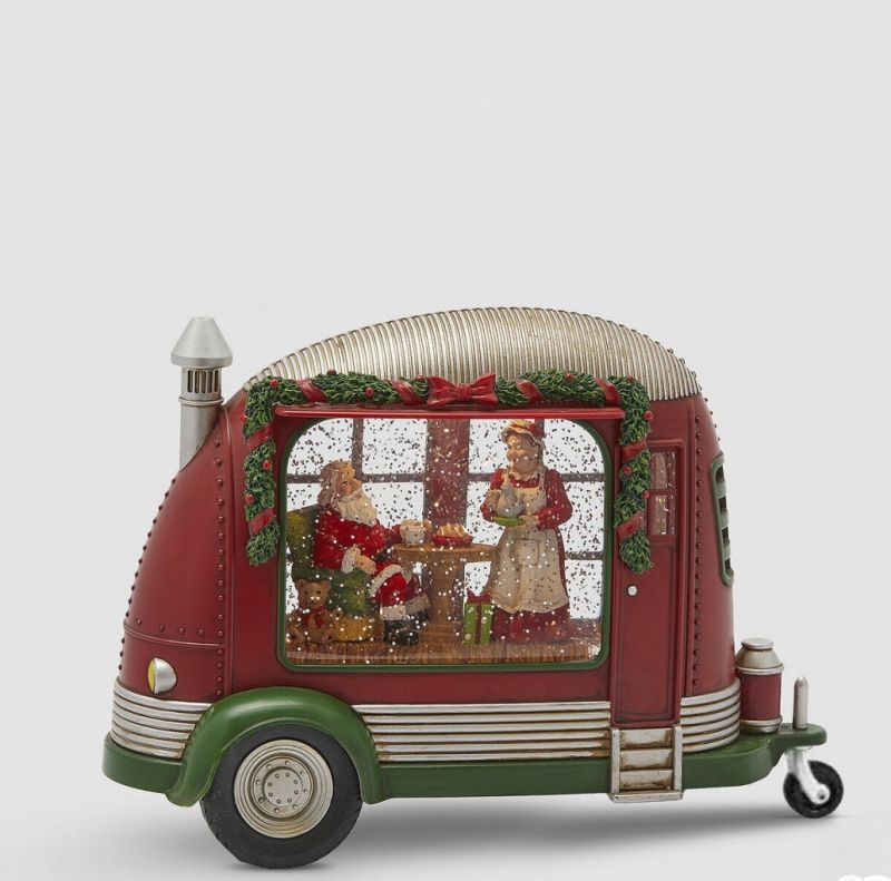 Създайте вълшебна празнична атмосфера у дома с тази очарователна коледна фигурка – Кемпер, украсен с блещукащ сняг, светеща лампа и сцена с Дядо Коледа.