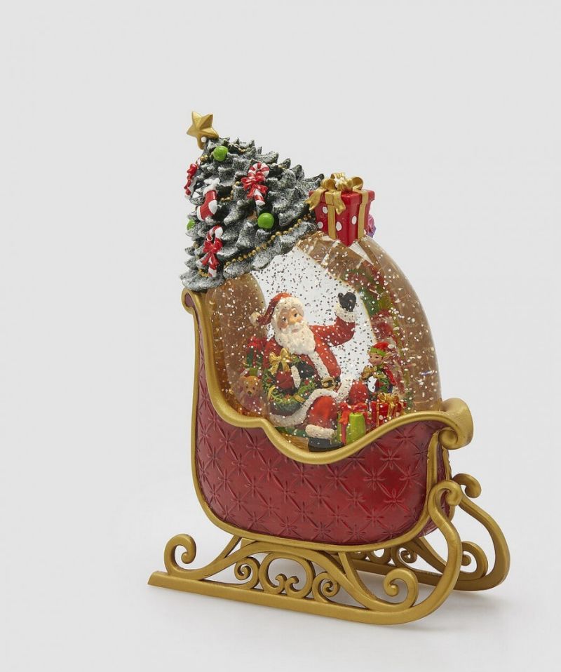 Създайте вълшебна празнична атмосфера у дома с тази очарователна коледна фигурка – Дядо коледа на шейна, украсен с блещукащ сняг, светеща лампа.