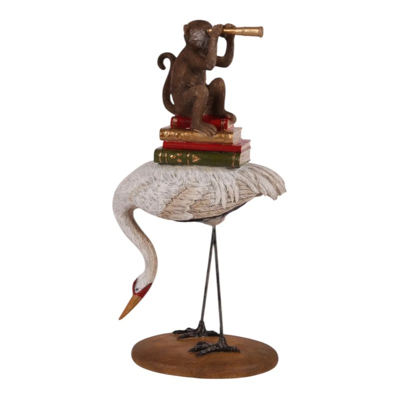 Тази елегантна фигурка изобразява маймуна, седнала грациозно на гърба на голяма бяла птица. Комбинацията от игривата маймуна и внушителната птица създава интригуващ контраст, придавайки на фигурката усещане едновременно за приключение и сила.
